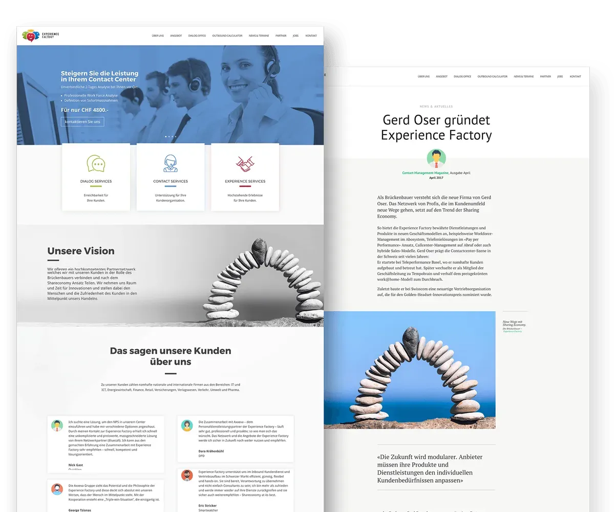 Das Startup Experience Factory versteht sich als Brückenbauer (Vermittler) und bietet ein unfassbar grosses Netzwerk. Sie bringen Spezialisten aus verschiedenen Branchen zusammen und entwickeln mit ihnen innovative Kundenerlebnisse und Businessmodelle für verschiedene Arbeitsbereiche. Zusammen bilden sie ein Netzwerk aus welchem massgeschneiderte Produkte und Dienstleistungen für Schweizer Firmen entstehen. Die Auftraggeber profitieren vom Wissen, der breiten Erfahrung und Innovation des zur Verfügung gestellten Netzwerkes.