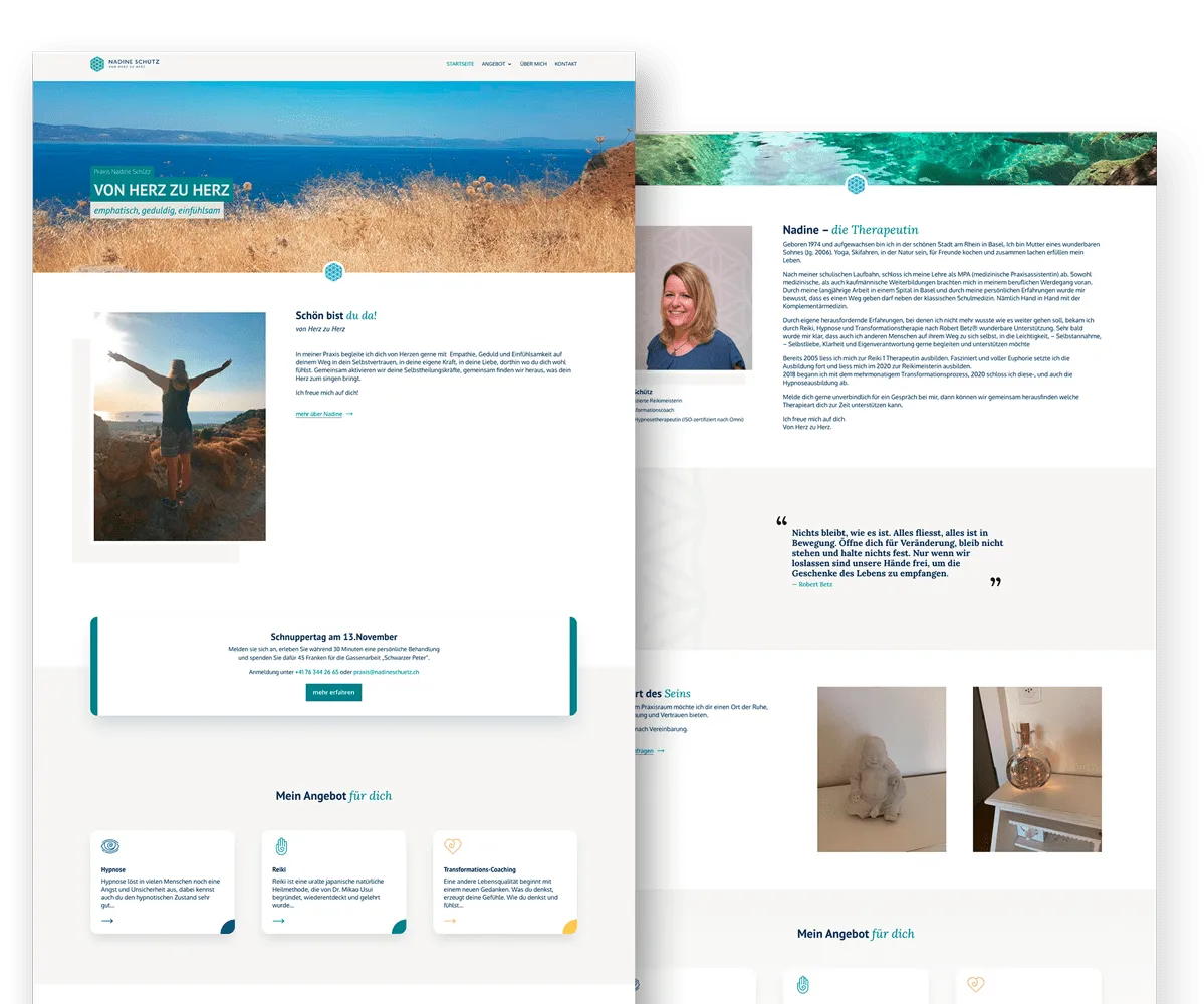 Nadine ist Reikimeisterin, Hypnosetherapeutin und Transformationscoach. Sie begleitet Dich von Herz zu Herz mit Empathie, Geduld und Einfühlsamkeit auf deinem Weg in dein Selbstvertrauen, in deine eigene Kraft, in deine Liebe, dorthin wo du dich wohl fühlst.
